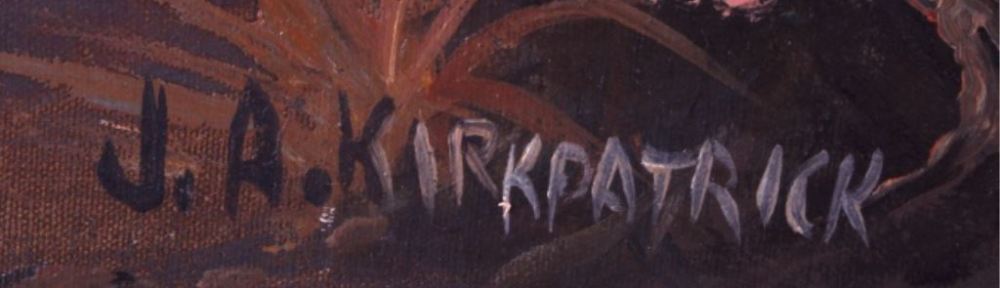 Although commercial artist by trade, Kirkpatrick produced oil paintings on the side. He was exceptionally prolific and created more than 3,000 original paintings over the course of his life. His work was often western themed and featured scenes of cowboys, ranchers, and American Indians. Obsessed with realistic detail, he filled his Jamestown studio with antique saddles, hats, chaps, tools, and other items from the ‘cowboy era’ that he would refer to when painting.